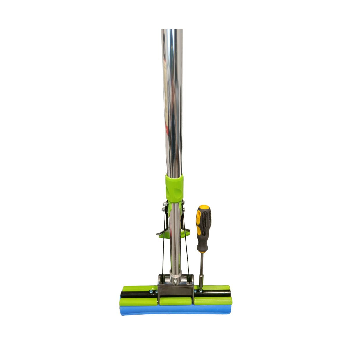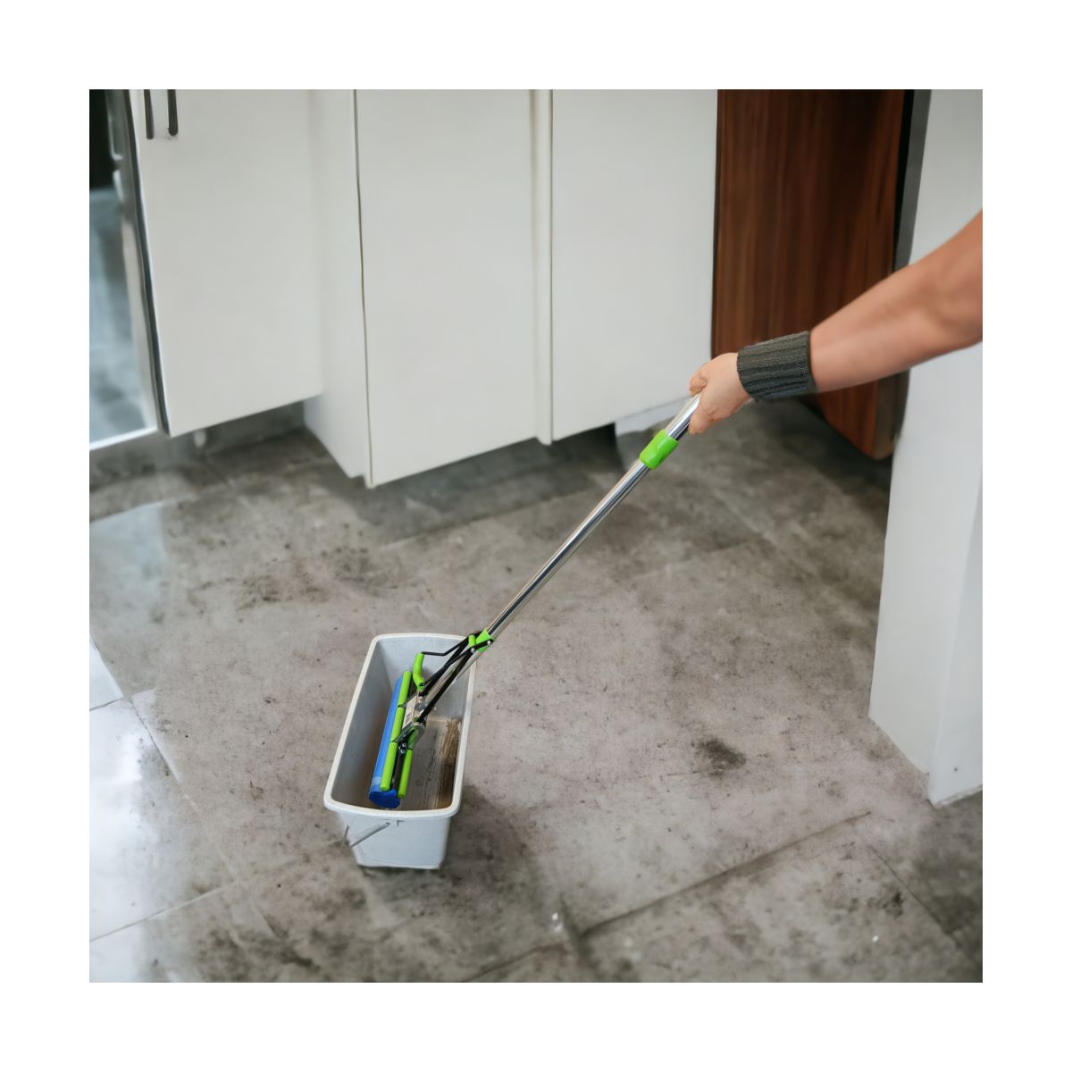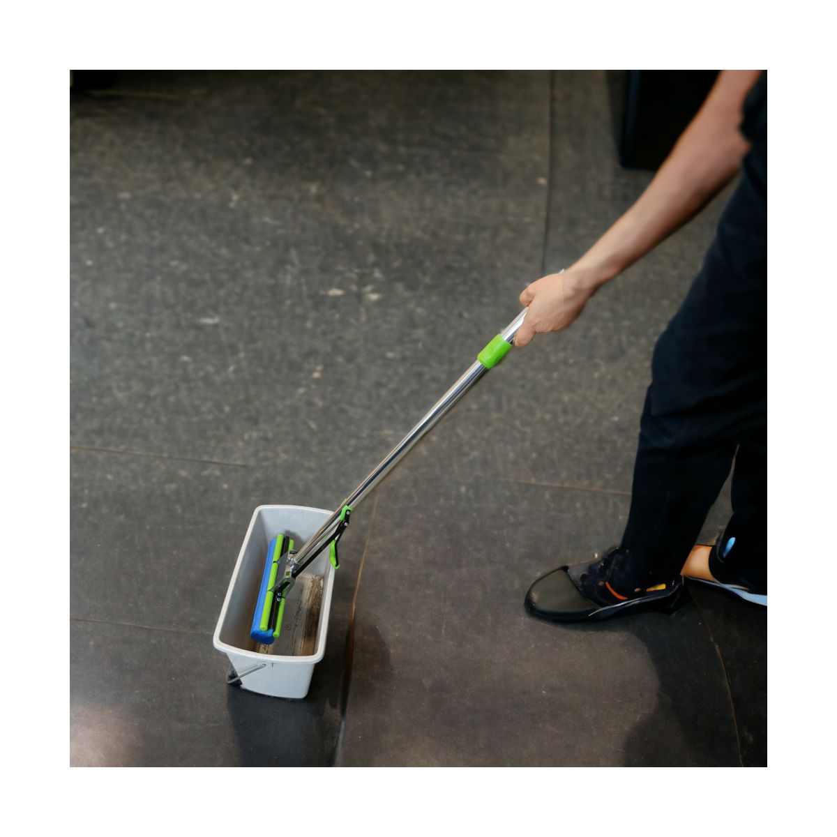 Parkett-, Holz-, Kork-, Laminat-, PVC-, Fliesen-, Stein- und sogar Vertikale Oberflächen können dank des feinporigen Mopschwamms gereinigt werden. Der Teleskopstiel mit einer maximalen Länge von 125 cm und die mechanische Wringfuktion, welche über einen soliden & ergonomisch geformten Hebel von Hand betätigt wird um den Schwamm auszuwringen, ermöglichen sehr komfortables und rückenschonendes Arbeiten.