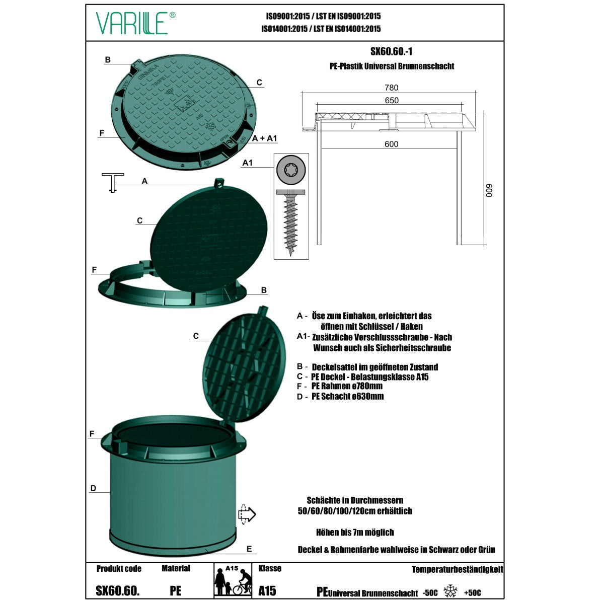 Die Gesamthöhe des Schachtes inkl. Deckel ist ca. 80cm. (andere Höhen auf Anfrage verfügbar)